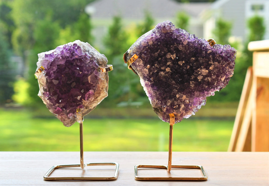 Effortlessly display your favorite gemstones anywhere in your home. Decorative gold or silver wire stands hold clusters, points, slices, and geodes aloft for a natural exhibit of glittering gems.