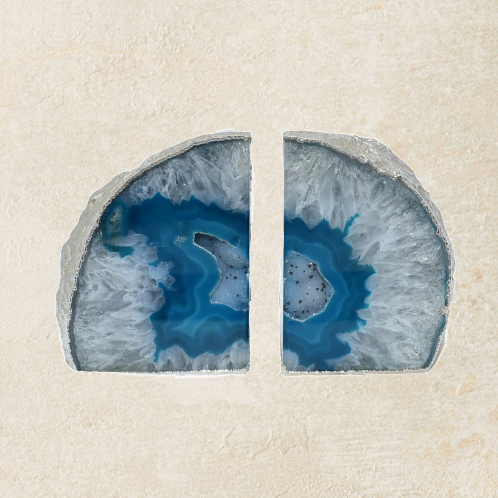 These one-of-a-kind agate bookends will stand out on your shelves due to their bright colors. Each specimen reveals intricate patterns in the polished stone. The silver electroplated crust encases the jewel-tone interior and refines the look even further. Choose from a multitude of colors including teal, pink, natural, and green.