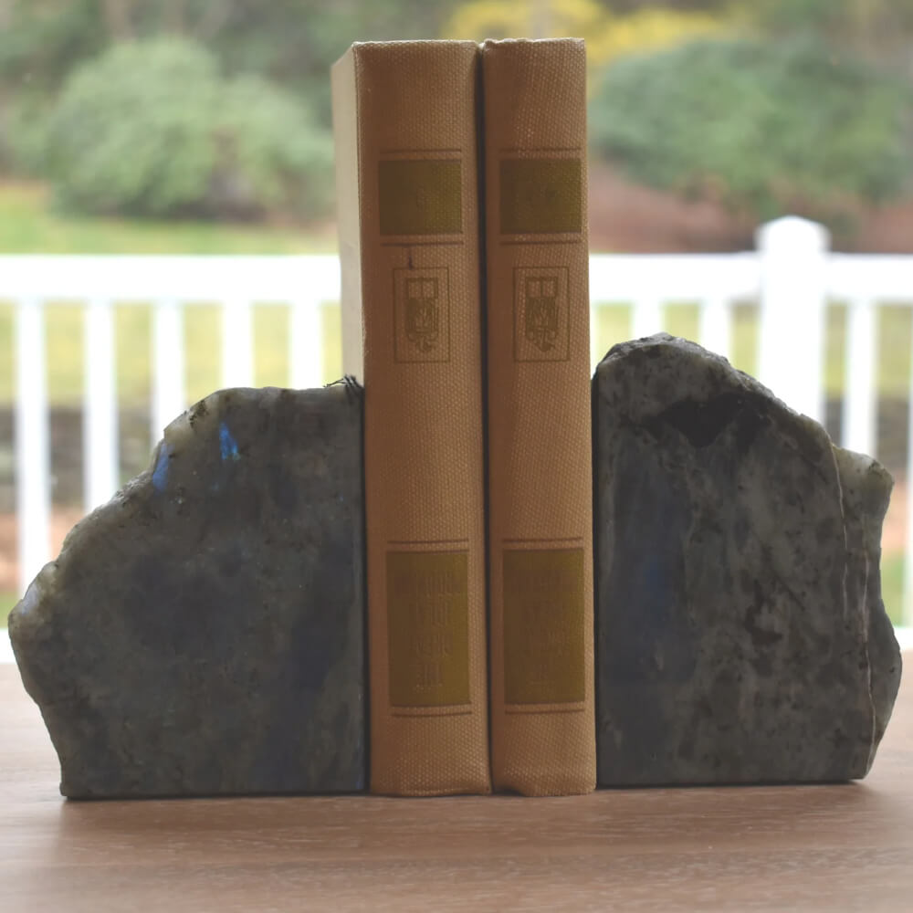 Slabs of raw labradorite form these mystical gemstone bookends. Gentle labradorite is the perfect crystal companion when reading your favorite book. The shimmering pearly hues of blue and green encourage you to keep your head in the clouds for a little while longer. Each bookend features felt pads on the bottom to keep the slabs in place while on display. Tidy your bookshelf with medium or large labradorite bookends.