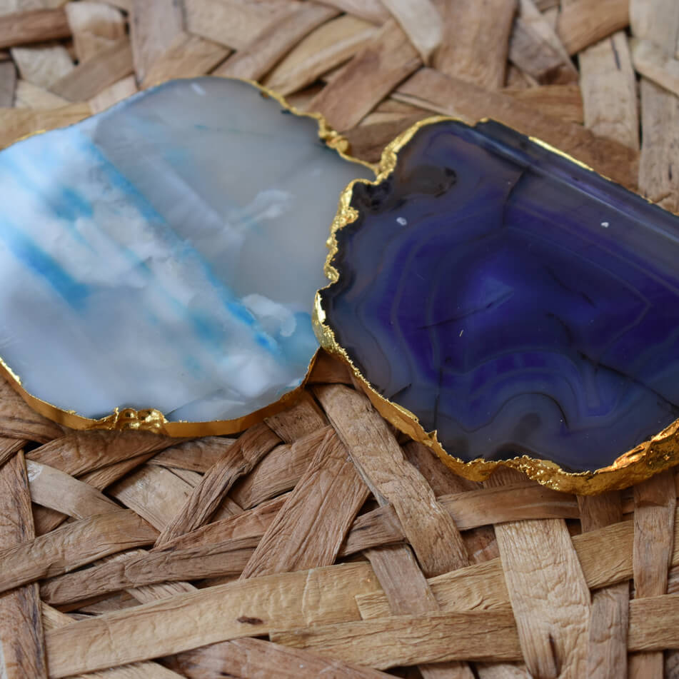 Place these gnarled agate coasters on your tabletop to prevent scratches and water stains. Natural agate has many protective qualities and makes for a gorgeous statement piece in your home. Each naturally shaped slice comes in a unique pattern in your choice of brightly colored agate. Coasters are trimmed in a striking gold.